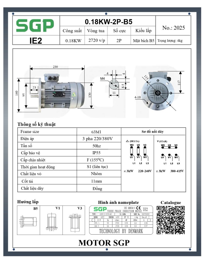 Thông số kỹ thuật của Động Cơ Điện SGP 0.18kW 2 Cực Mặt Bích 63M1-2-0.18KW (IE2-B5)