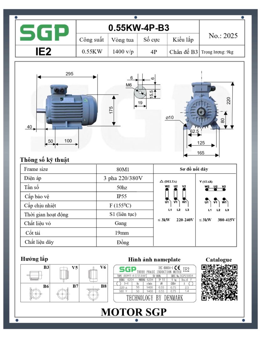 Thông số kỹ thuật của Động Cơ Điện SGP 0.55kW 4 Cực Chân Đế