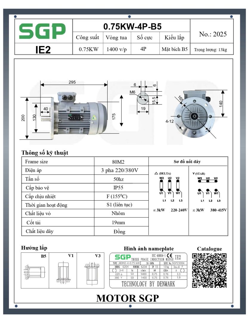 • Motor SGP 0.75kW 4P thường sử dụng điện áp 3 pha 220/380V – 50Hz.