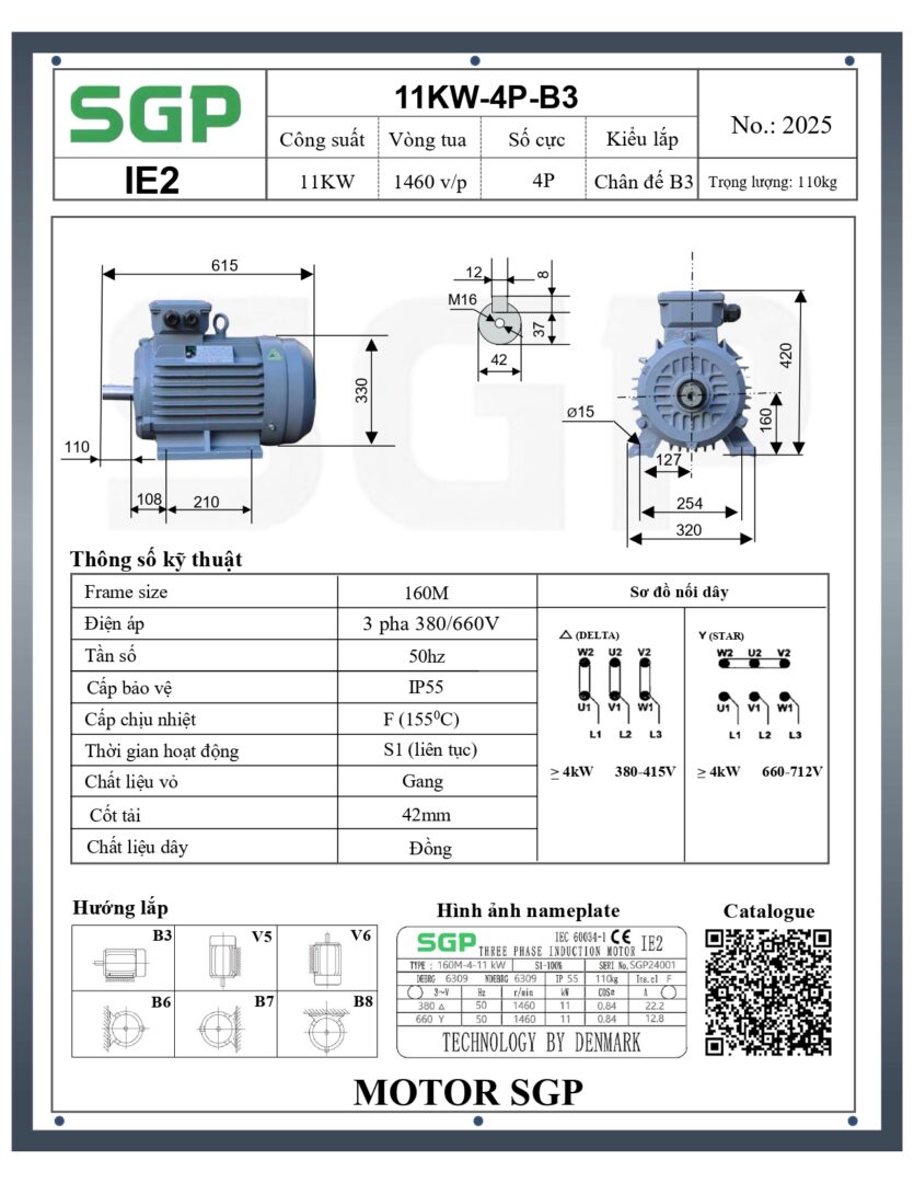 Thông số kỹ thuật của Động Cơ Điện SGP 11kW 4 Cực Chân Đế