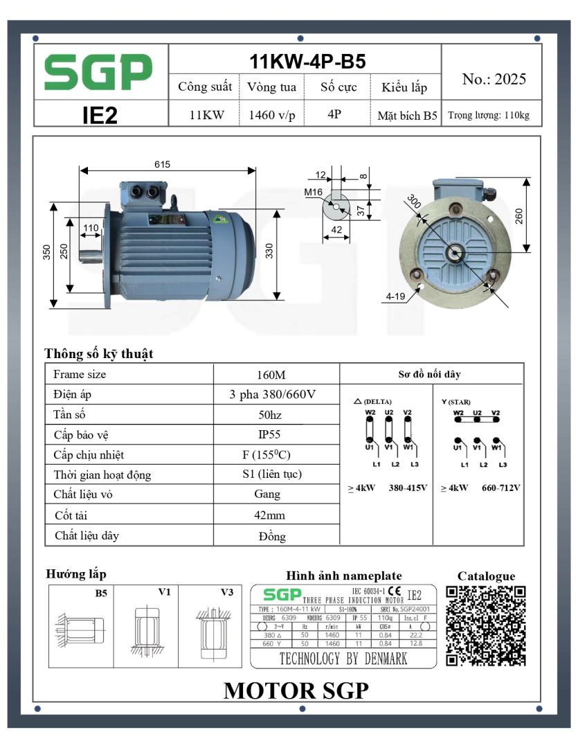 Thông số kỹ thuật của Động Cơ Điện SGP 11kW 4 Cực Mặt Bích 160M-4-11KW (IE2-B5)