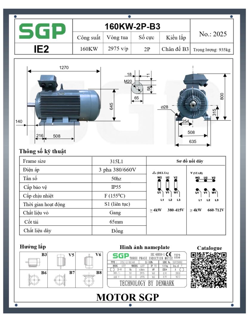 Thông số kỹ thuật của Động Cơ Điện SGP 160kW 2 Cực Chân Đế 315L1-2-160kW (IE2-B3)