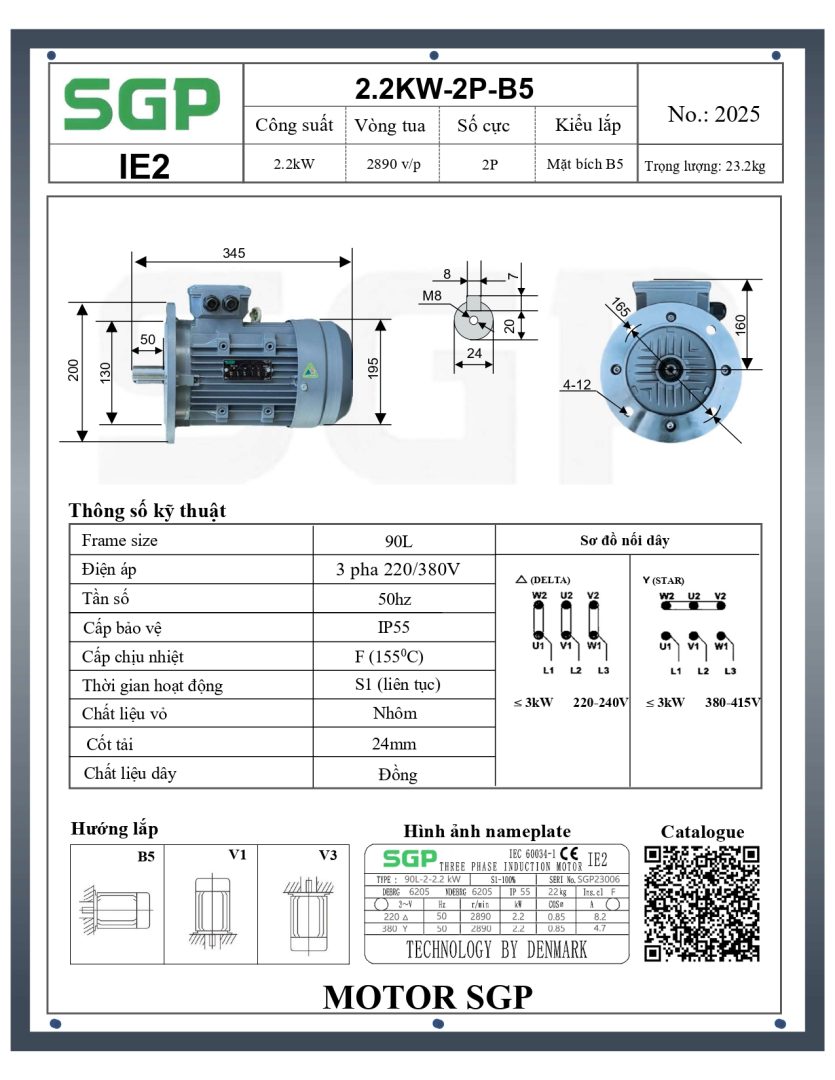 Motor có công suất 2.2kW (tương đương 3HP), tốc độ quay 2 cực ~2890 vòng/phút, frame size 90L. Thiết kế kiểu lắp mặt bích B5 giúp tích hợp linh hoạt trong nhiều thiết bị máy móc. Động cơ được trang bị cấp cách điện F, chỉ số bảo vệ IP55 – phù hợp với môi trường có độ ẩm, bụi hoặc yêu cầu vận hành liên tục ổn định.