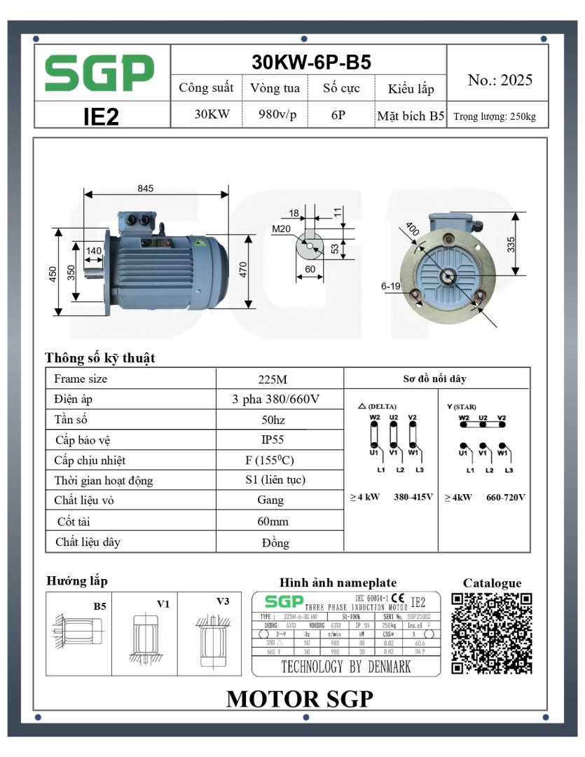 Thông số kỹ thuật của Động Cơ Điện SGP 30kW 6 Cực Mặt Bích 225M-6-30KW (IE2-B5)
