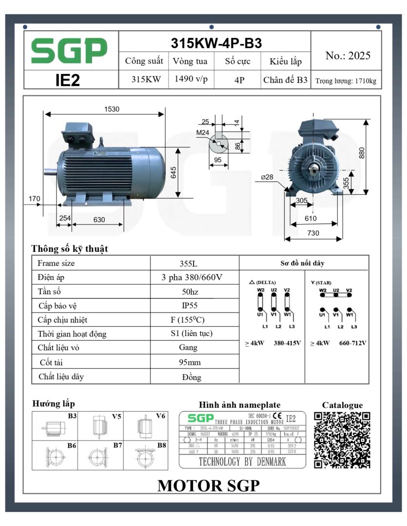 Thông số kỹ thuật của Động Cơ Điện SGP 315kW 4 Cực Chân Đế