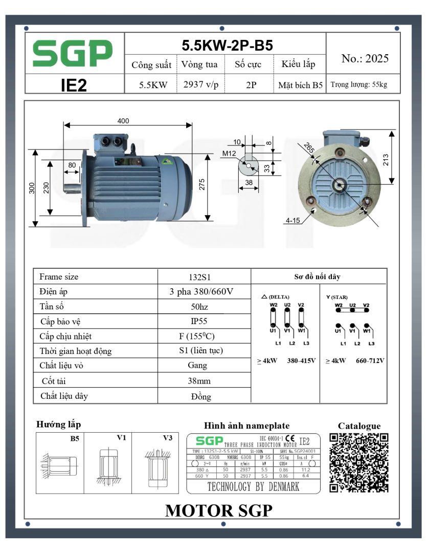 Thông số kỹ thuật của Động Cơ Điện SGP 5.5kW 2 Cực Mặt Bích 132S1-2-5.5KW (IE2-B5)