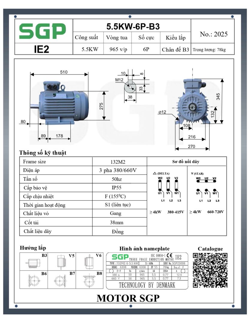 Thông số kỹ thuật của Động Cơ Điện SGP 5.5kW 6 Cực Chân Đế