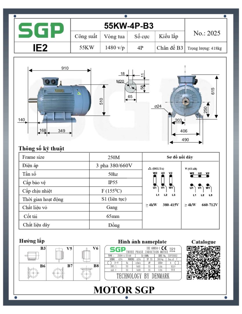 Thông số kỹ thuật của Động Cơ Điện SGP 55kW 4 Cực Chân Đế