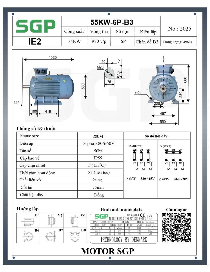 Thông số kỹ thuật của Động Cơ Điện SGP 55kW 6 Cực Chân Đế
