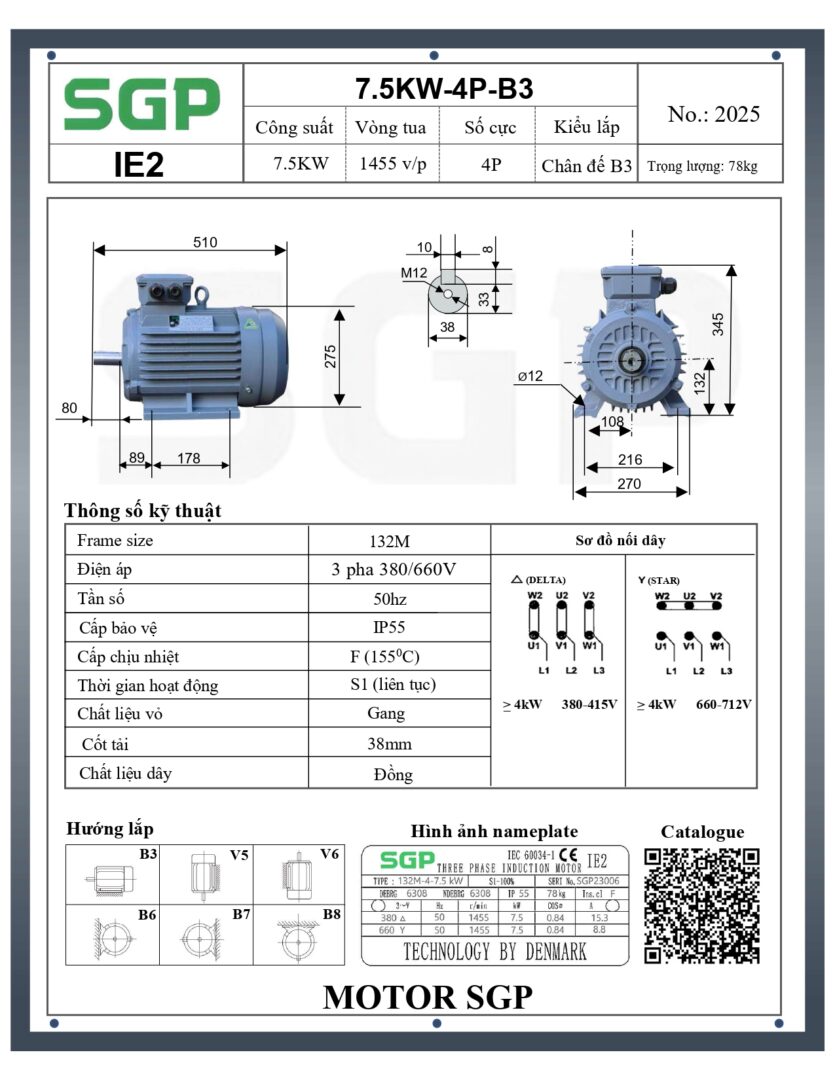 Thông số kỹ thuật của Động Cơ Điện SGP 7.5kW 4 Cực Chân Đế