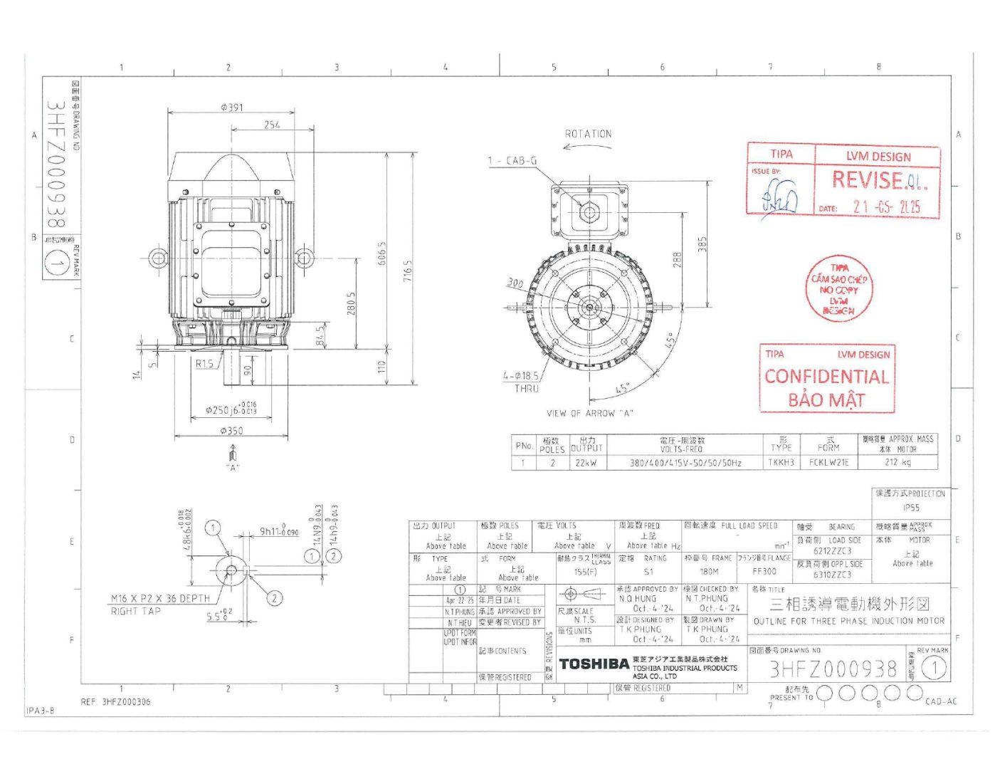 Động cơ điện TOSHIBA IE3 22kW 2 cực mặt bích được thiết kế theo tiêu chuẩn quốc tế, mang lại hiệu quả kinh tế – độ bền – an toàn vận hành vượt trội, là lựa chọn hàng đầu cho các hệ thống sản xuất hiện đại và tự động hóa công nghiệp.