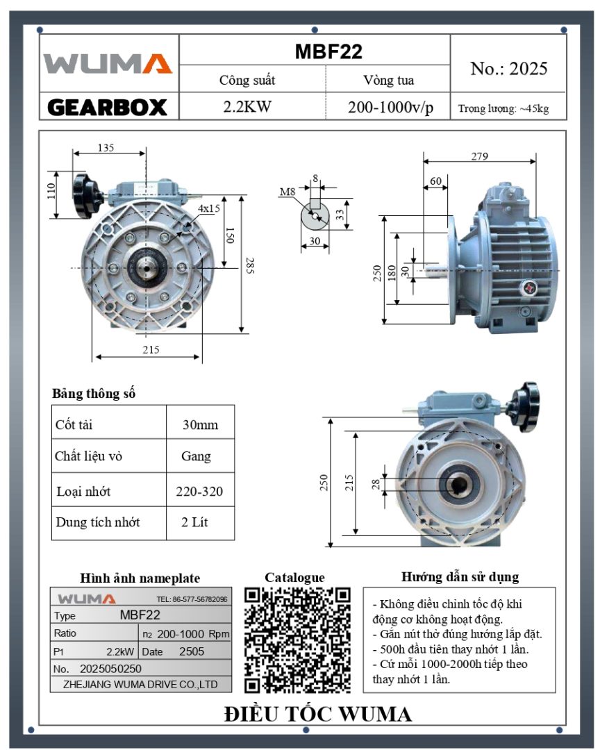 Thông số kỹ thuật của Hộp Điều Tốc Mặt Bích WUMA 2.2kW MBF22