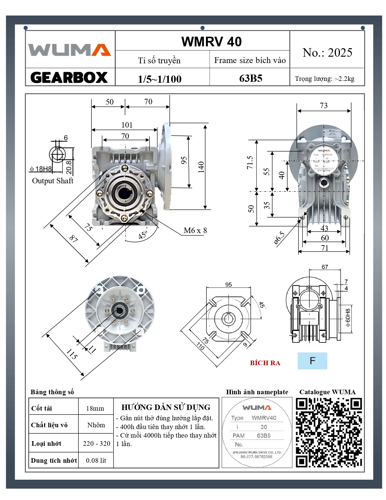 Giới Thiệu Hộp Giảm Tốc Cốt Âm WUMA 0.18kW WMRV40