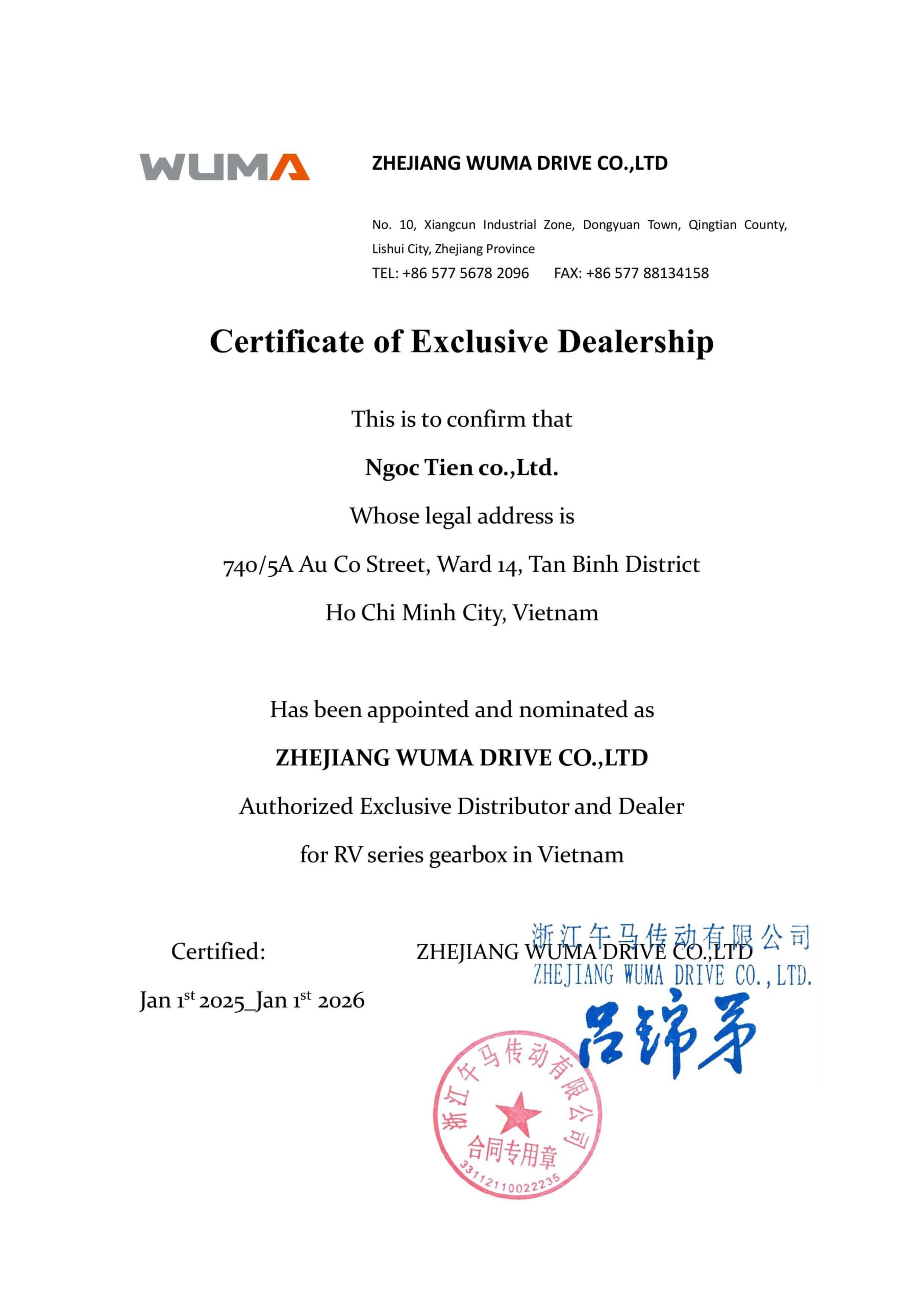 Chứng nhận nhà phân phối Wuma