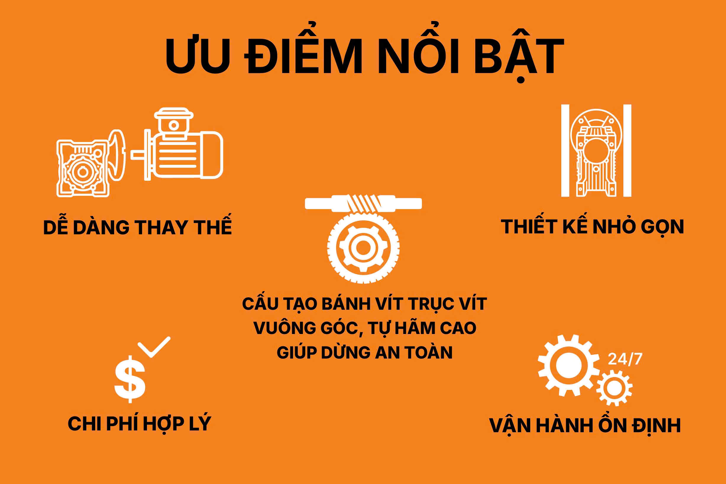 Khả năng tự hãm cao: cấu tạo bánh vít giúp dừng máy an toàn.