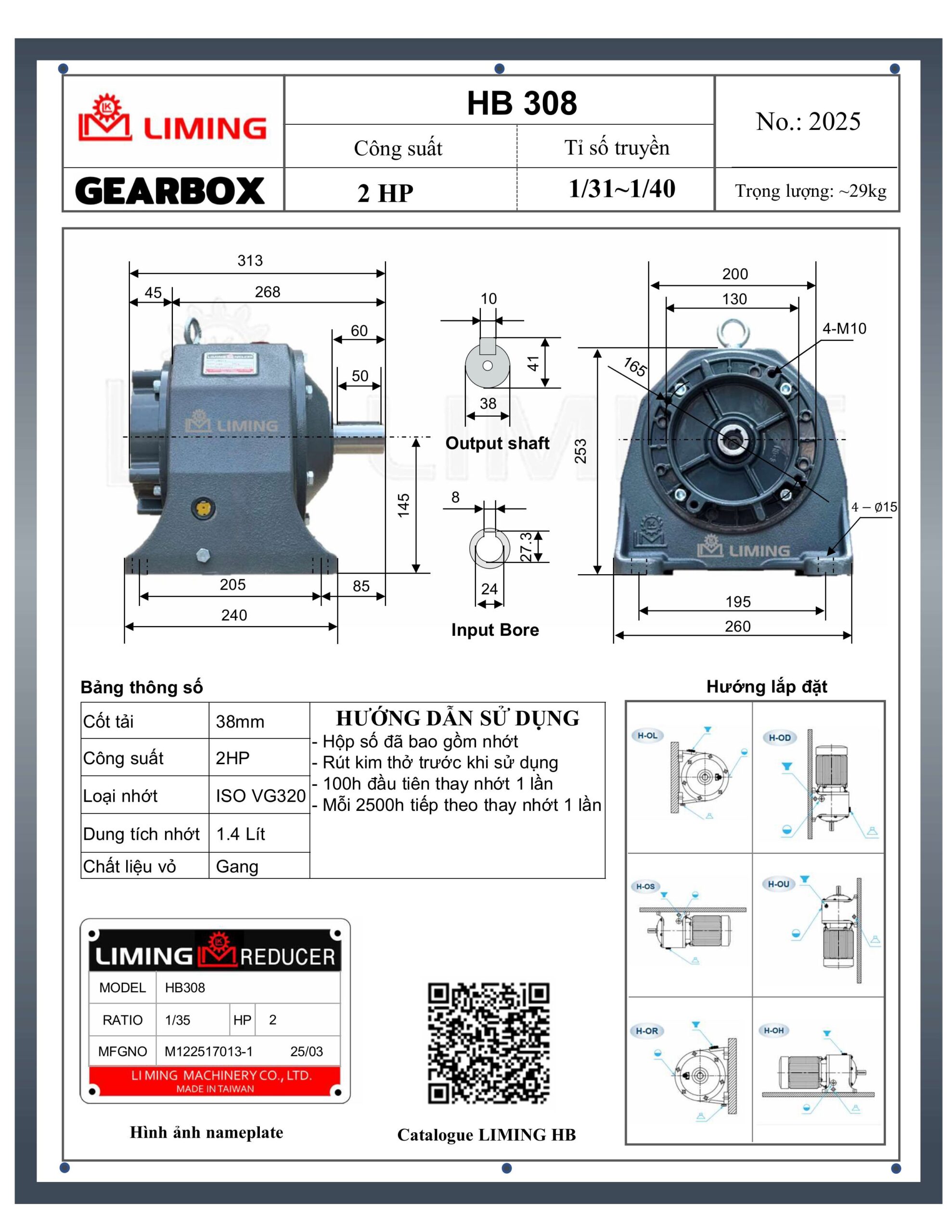 Với kinh nghiệm lâu năm và uy tín toàn cầu của Liming, kết hợp cùng dịch vụ tận tâm từ Ngọc Tiên, Hộp Giảm Tốc Liming Chân Đế HB308-2HP luôn mang đến hiệu suất ổn định, độ bền vượt trội và là lựa chọn đáng tin cậy cho các doanh nghiệp chú trọng chất lượng thiết bị truyền động.