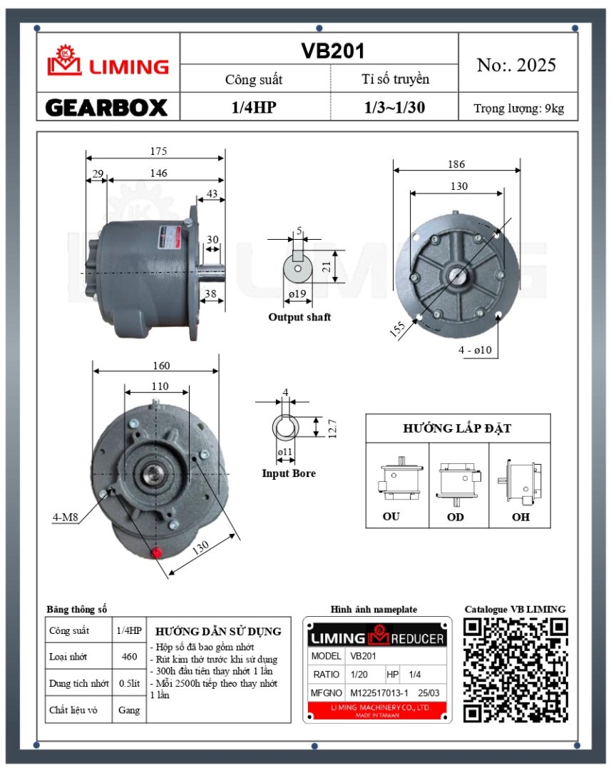 LƯU Ý LẮP ĐẶT HỘP GIẢM TỐC LIMING MẶT BÍCH VB201-1/4HP