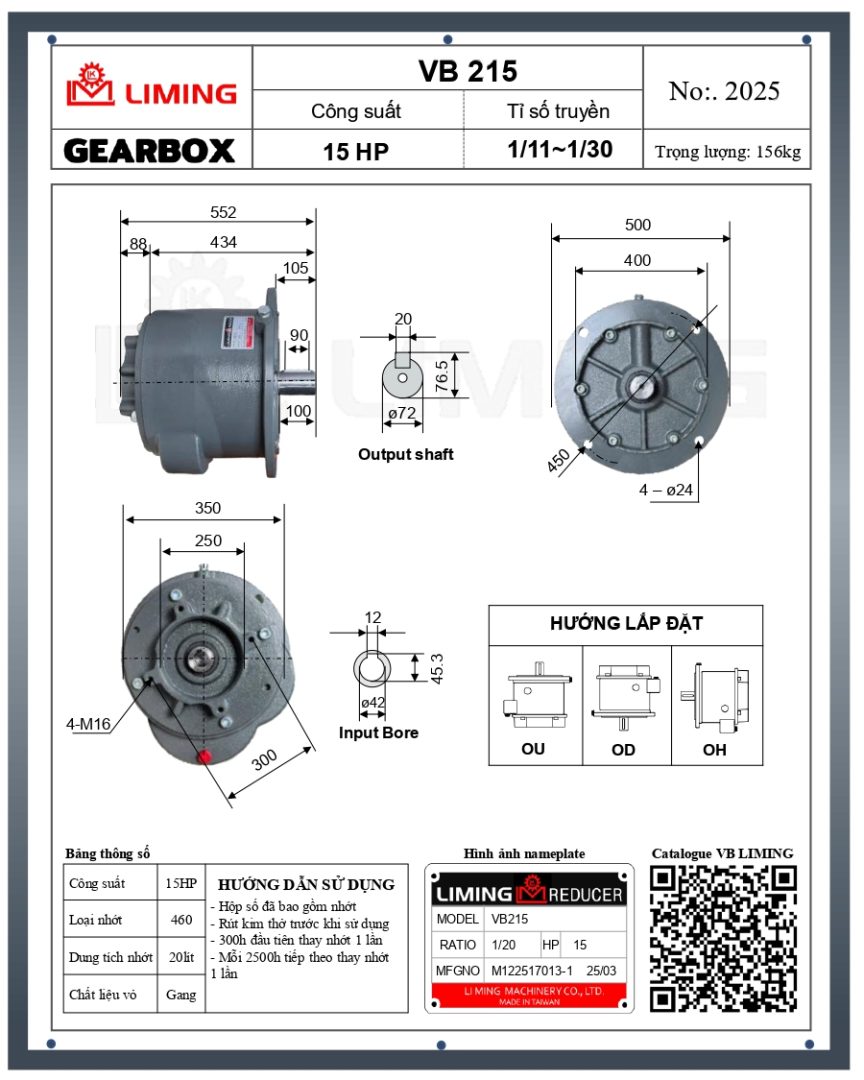- Hộp giảm tốc Liming VB215-15Hp được thiết kế với bánh răng chính xác cao và vỏ gang đúc nguyên khối, giúp truyền động êm ái, khỏe và giảm tối đa rung lắc trong quá trình hoạt động.