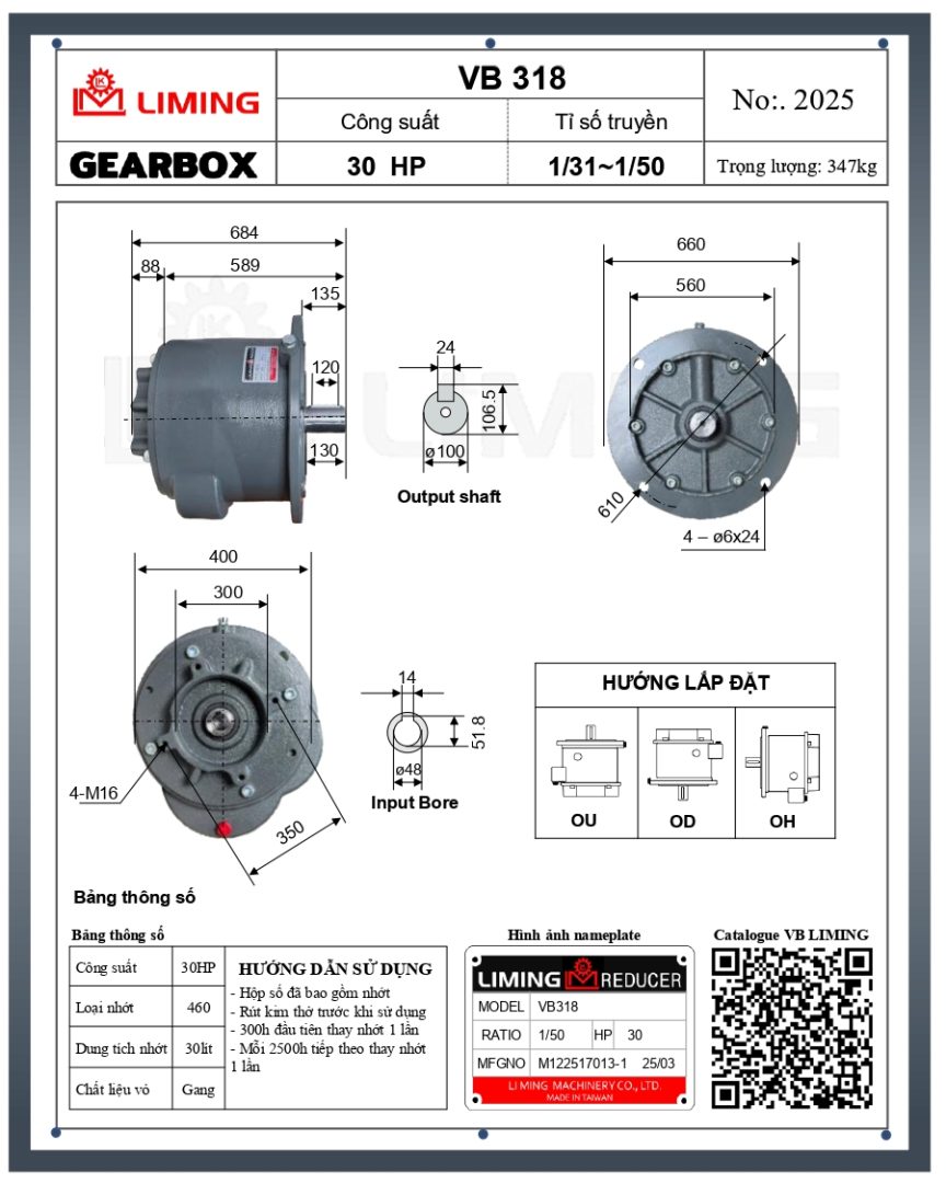 Khi lắp đặt giảm tốc Liming mặt bích VB318-30Hp, cần tuân thủ đúng hướng dẫn kỹ thuật để đảm bảo an toàn và tăng tuổi thọ thiết bị: