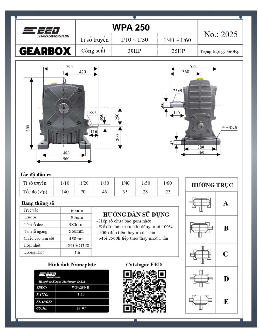 Hướng dẫn sử dụng & lưu ý khi lắp đặt hộp giảm tốc trục vít EED WPA 250