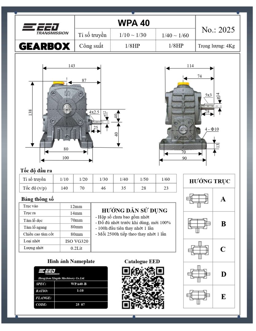 👉 EED WPA 40 là lựa chọn phù hợp cho các hệ thống truyền động quy mô nhỏ, cần hộp số gọn – vận hành êm – an toàn, đồng thời tối ưu chi phí đầu tư.