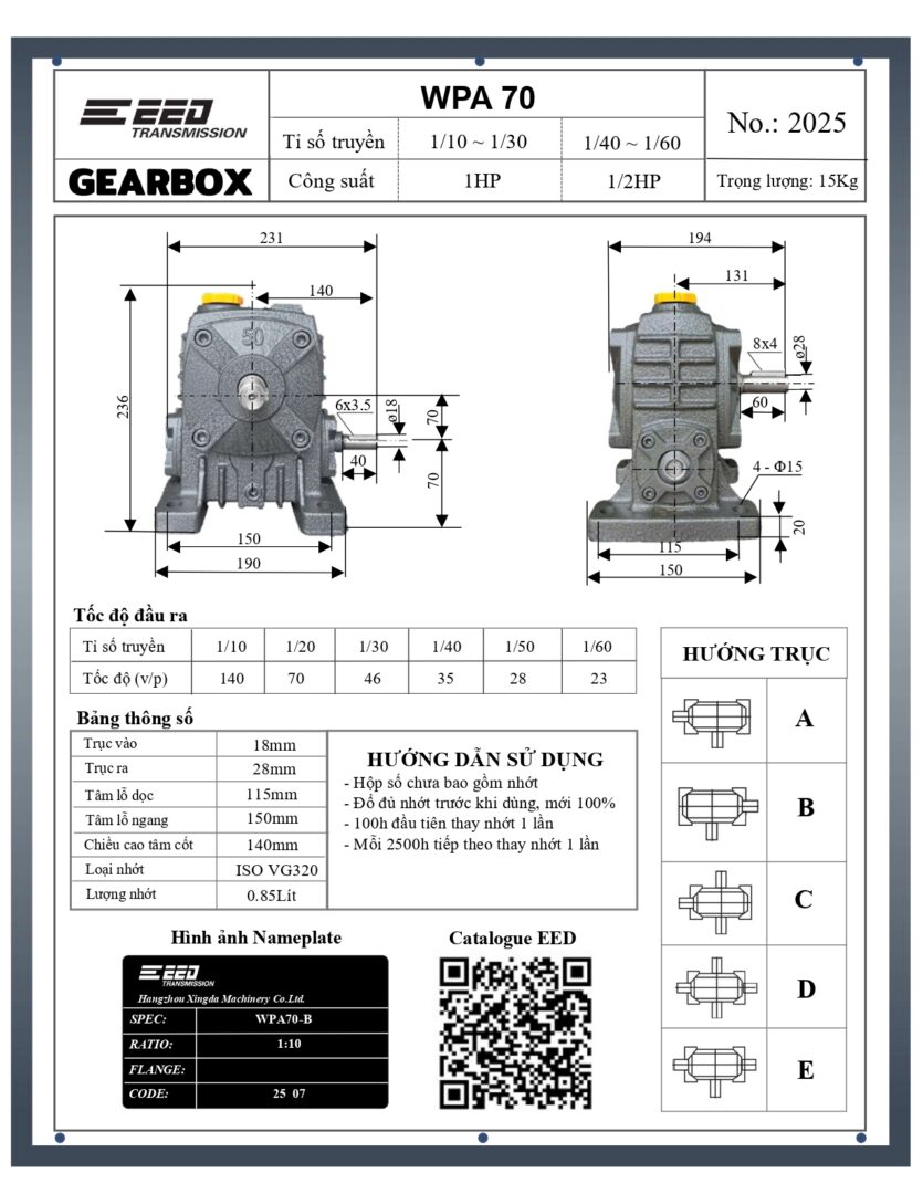 👉 EED WPA 70 là lựa chọn phù hợp cho các hệ thống truyền động tải nhẹ, cần hộp số gọn, dễ lắp, vận hành ổn định và an toàn trong điều kiện làm việc thực tế.