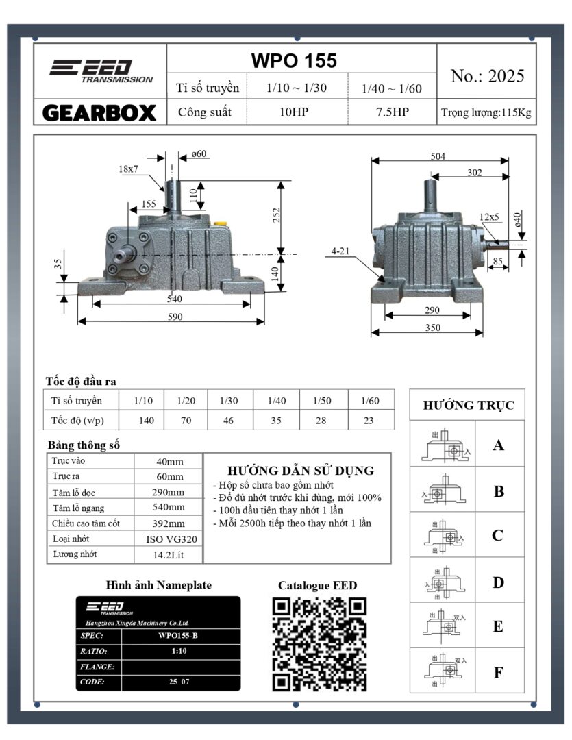 • Tốc độ trục vào của hộp giảm tốc WPO 155 cần được kiểm soát trong giới hạn cho phép, không vượt quá 1.800 vòng/phút.