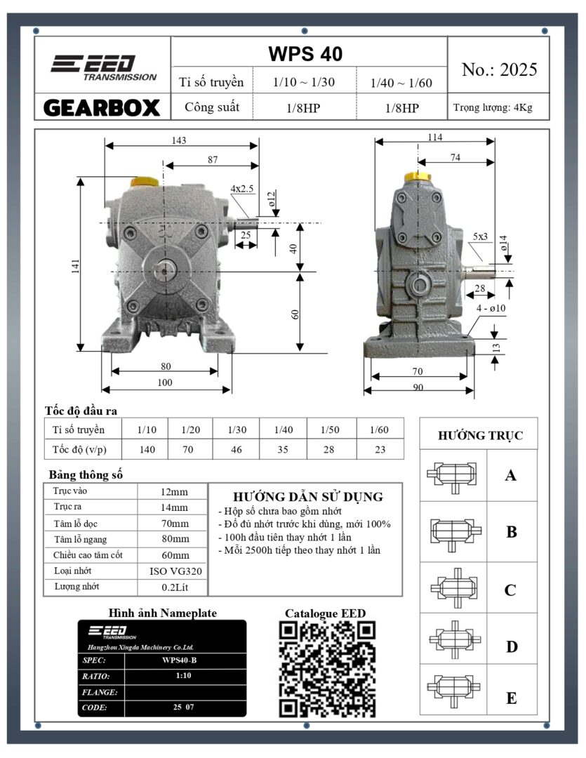 Hộp giảm tốc trục vít EED WPS 40 vỏ gang, tỉ số truyền 1/10 đến 1/60, vận hành êm ái, tự hãm tốt, bền bỉ, giao hàng nhanh, sẵn kho Ngọc Tiên