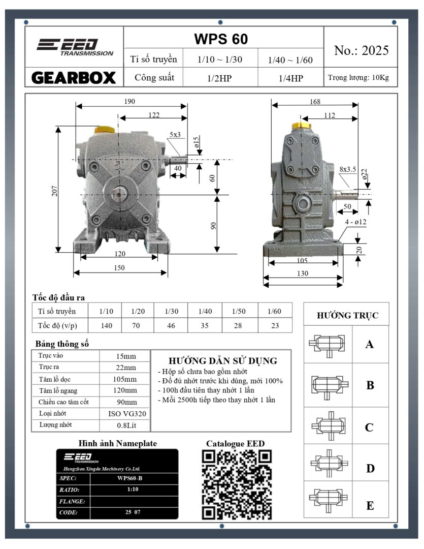 Hộp giảm tốc trục vít EED WPS 60 vỏ gang, tỉ số truyền 1/10 đến 1/60, vận hành êm ái, tự hãm tốt, bền bỉ, giao hàng nhanh, sẵn kho Ngọc Tiên