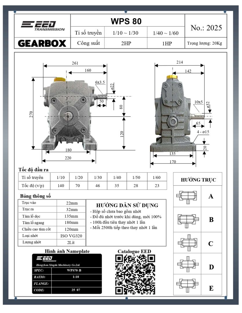 Hộp giảm tốc trục vít EED WPS 80 vỏ gang, tỉ số truyền 1/10 đến 1/60, vận hành êm ái, tự hãm tốt, bền bỉ, giao hàng nhanh, sẵn kho Ngọc Tiên