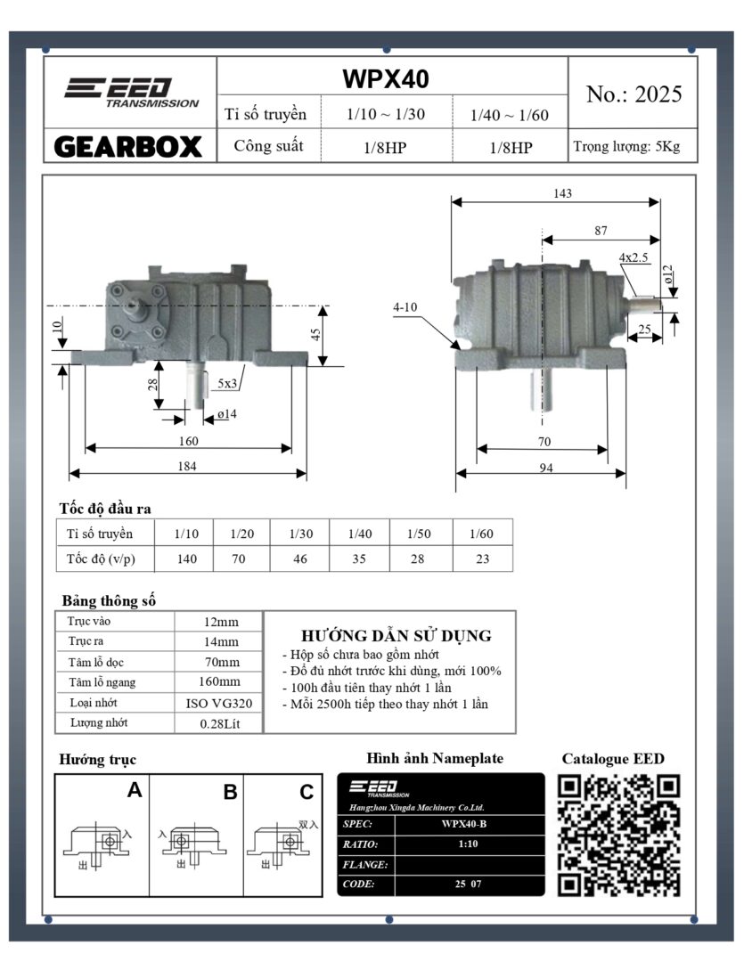 Hộp giảm tốc trục vít EED WPX 40 vỏ gang, tỉ số truyền 1/10 đến 1/60, vận hành êm ái, tự hãm tốt, bền bỉ, giao hàng nhanh, sẵn kho Ngọc Tiên