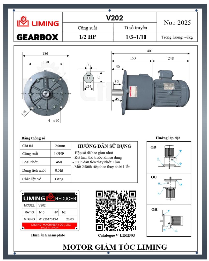 HƯỚNG DẪN LẮP ĐẶT MOTOR GIẢM TỐC LIMING MẶT BÍCH V202-1/2HP
