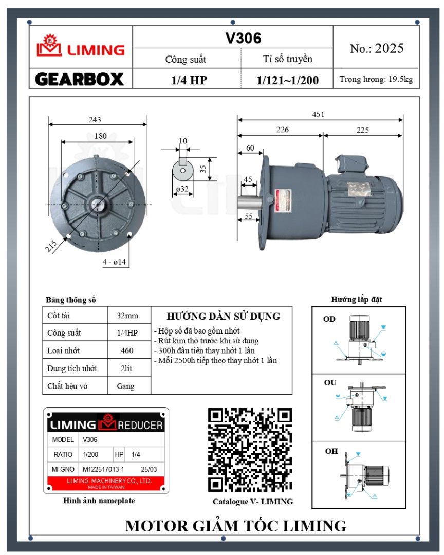 HƯỚNG DẪN LẮP ĐẶT MOTOR GIẢM TỐC LIMING MẶT BÍCH V306-1/2HP