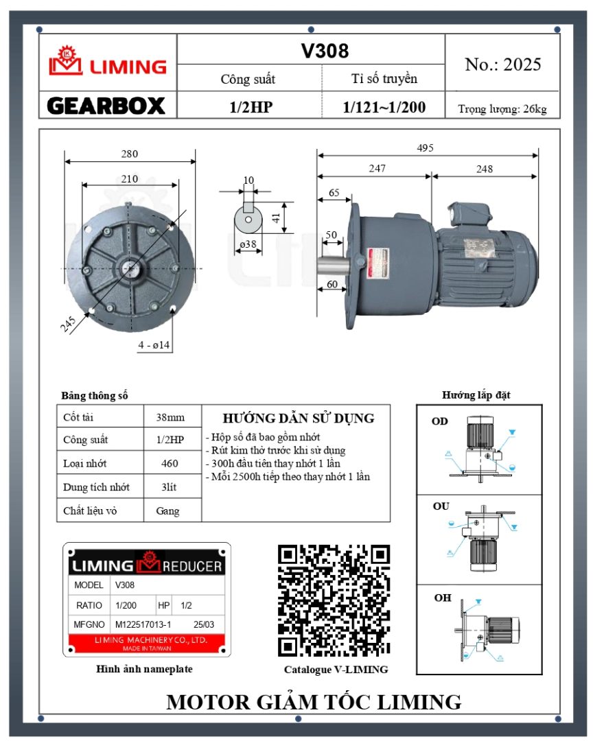 HƯỚNG DẪN LẮP ĐẶT MOTOR GIẢM TỐC LIMING MẶT BÍCH V308-1/2HP