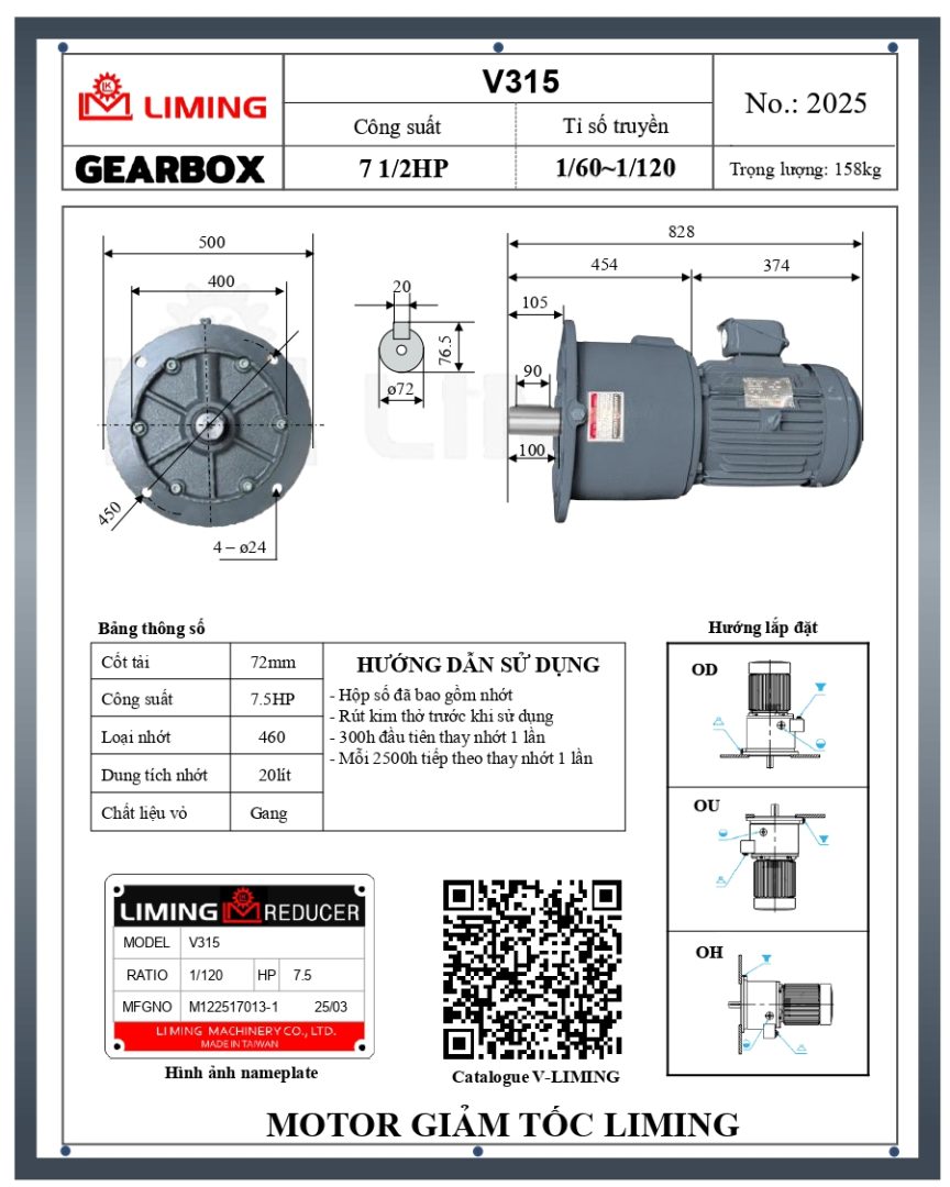 HƯỚNG DẪN LẮP ĐẶT MOTOR GIẢM TỐC LIMING MẶT BÍCH V315-7.5HP