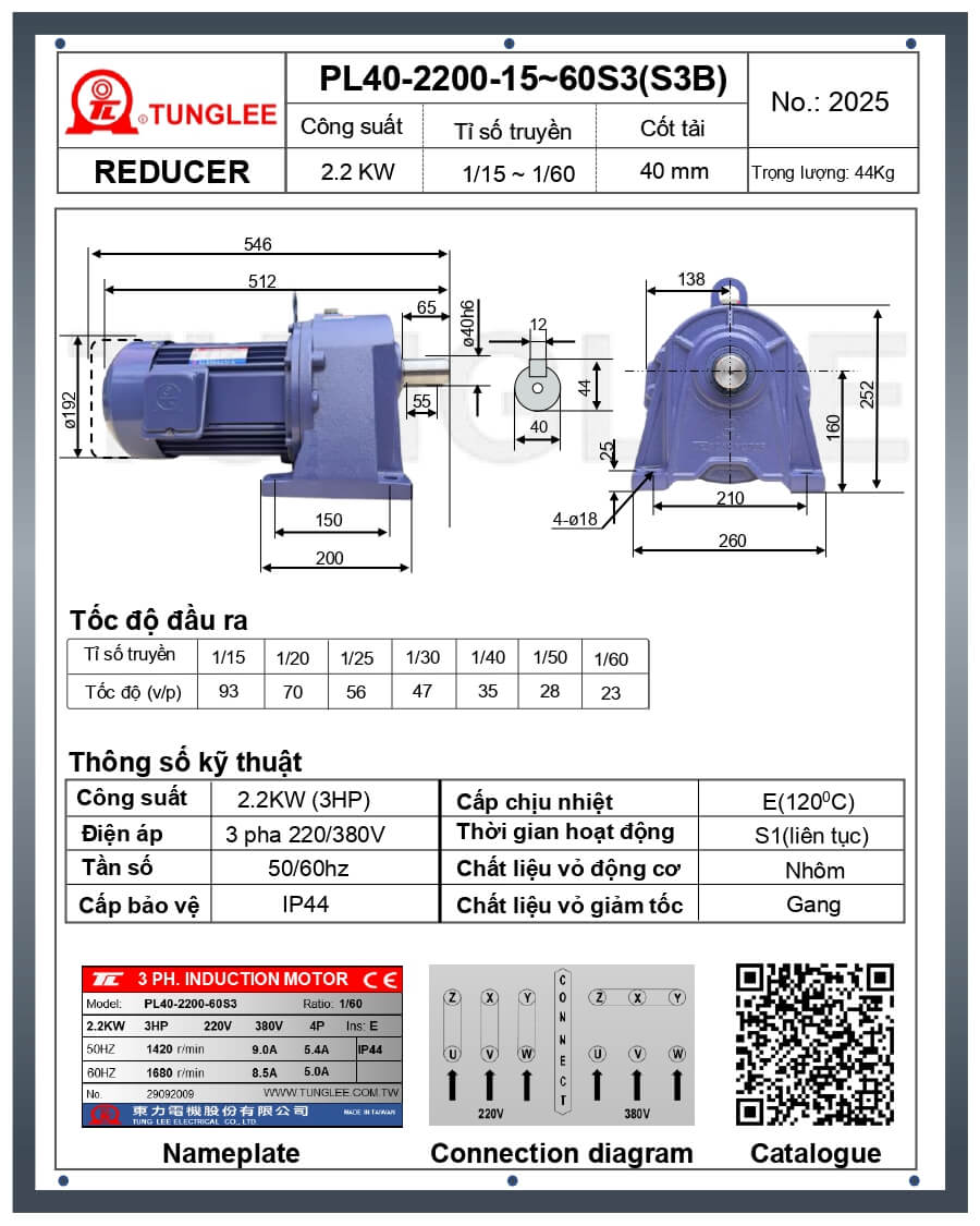 Tunglee PL40-2200-20S3 là dòng motor giảm tốc chân đế công suất 2.2kW, được thiết kế tối ưu cho các hệ thống truyền động cần hoạt động liên tục, ổn định và bền bỉ trong nhiều năm.