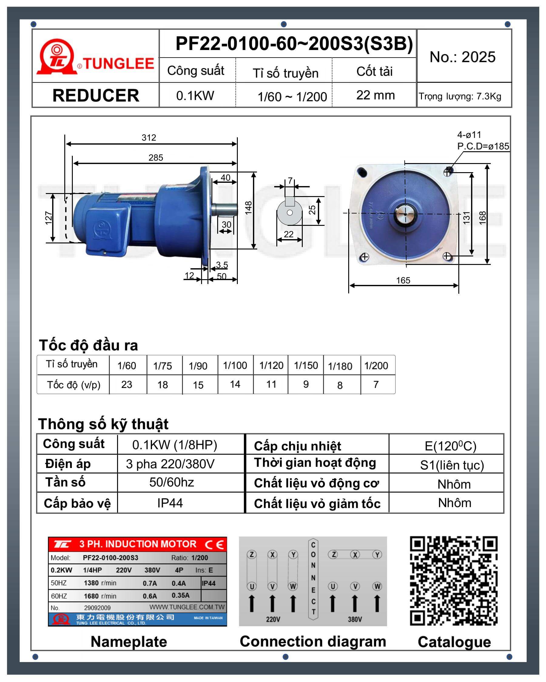 Tunglee PF22-0100-100S3 là dòng motor giảm tốc mặt bích công suất 0.1kW, sản xuất tại Đài Loan theo tiêu chuẩn công nghiệp cao. Thiết kế tối ưu cho các hệ thống truyền động cần hoạt động liên tục, ổn định và bền bỉ trong nhiều năm.