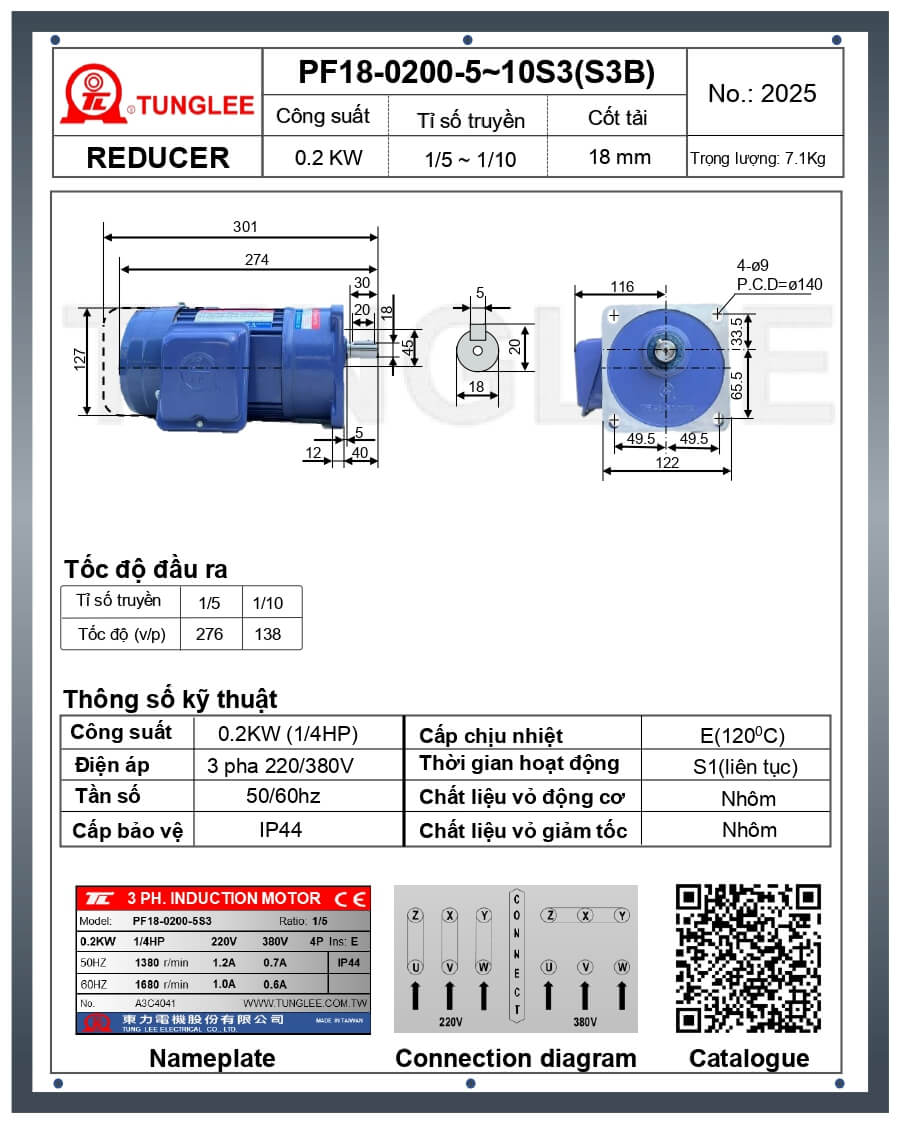Motor giảm tốc mặt bích Tunglee PF18-0200-10S3 – công suất 0.2kW, tỉ số truyền 1/10, truyền động êm, thương hiệu Đài Loan, sẵn kho, giao hàng toàn quốc.